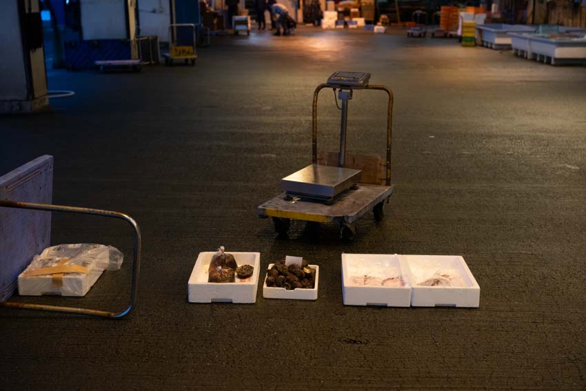 今、入荷中の魚は、剥き牡蠣、ナマコ、サザエ、養殖フグです。